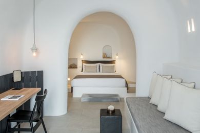 Our Traditional Suite, located in the Traditional Wing, is spacious, highlighted with discreet luxury, while designed and decorated in a unique style and color scheme. Once you get in, you can enjoy all the comfort of a large sitting area, complete with a cozy sofa bed and stylish decoration. Next, you will find the comfortable bedroom, perfectly suited for two, and the specially designed bathroom. The real highlight, however lies outside: in the suiteās private spacious terrace, admiring at the same time, the amazing views and sea landscapes Santorini has to offer, a rare luxury only our suite can provide. Ideal for couples and Honeymooners.